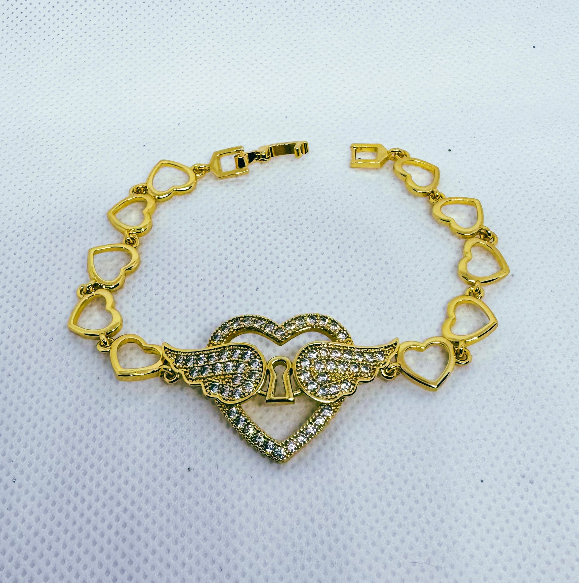 The Wings of Love Link features elegant gold fillings and intricate micro pave designs in a sophisticated heart and wings motif. Its polished finish and dimensions of 8.0 x 0.9 x 0.1 in make it a luxurious accessory for women, weighing 11.0 g and boasting a delicate 09 MM thickness.